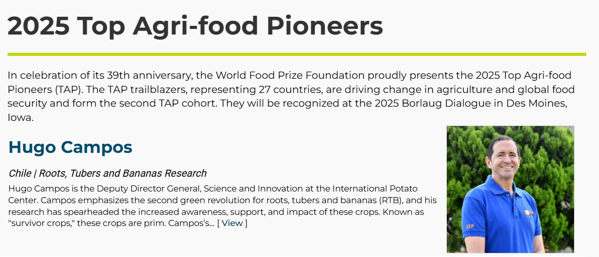 El Dr. Campos se desempeña actualmente como Subdirector General de Ciencia e Innovación del Centro Internacional de la papa CIP, y ha recibido este prestigioso reconocimiento que destaca su liderazgo global en innovación agrícola y su apasionada defensa de una nueva Revolución Verde a través de cultivos de raíces, tubérculos y banano.